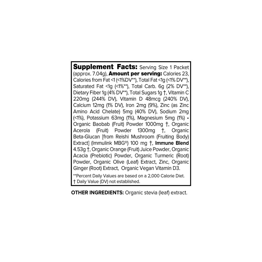 Enjoy a refreshing glass of citrus Immunity lightly sweetened with zero-sugar monk fruit and tastes of real orange, baobab fruit, ginger, and acerola cherry.