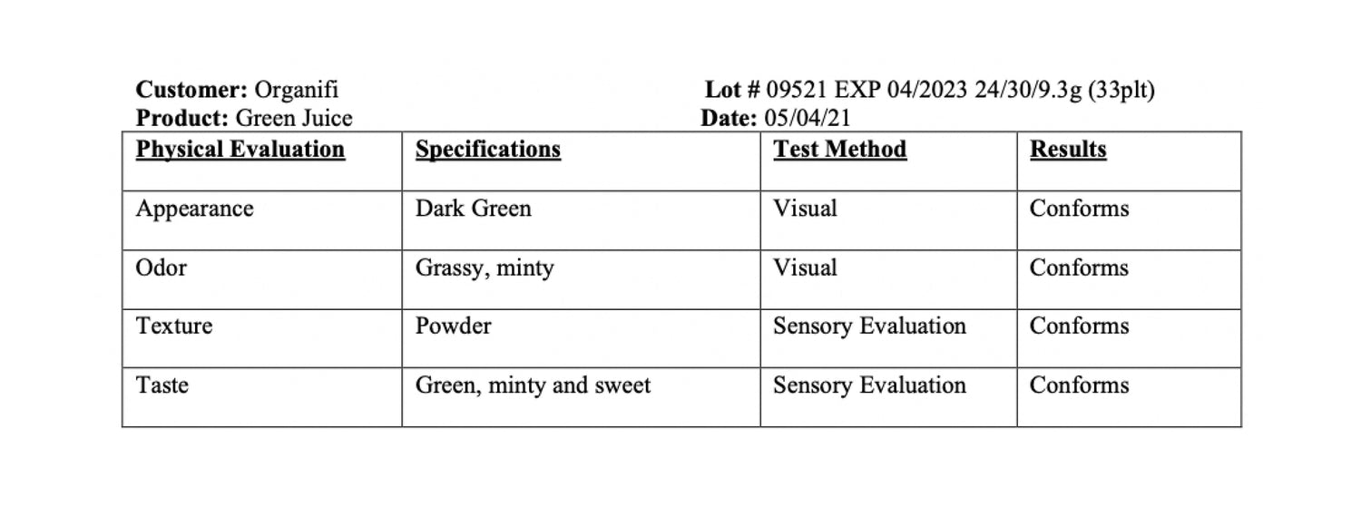 With each batch, we receive a COA (Certificate Of Analysis) document issued by a trusted lab that confirms the blend has undergone strict testing. The COA provides detailed information ensuring the finished blends meet organifiâs highest quality standard.