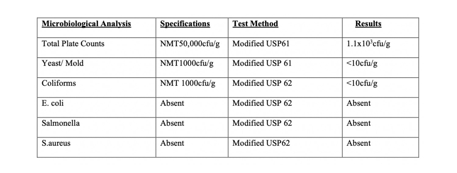we test every product batch for: Microorganisms & pathogens, Heavy metals, Chemical Pesticides/Fertilizers, Synthetic Herbicides/Fungicides, GMOâs, Glyphosate, Gluten, Other contaminants