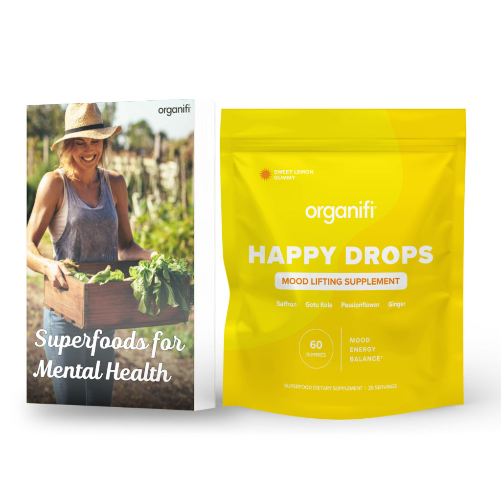 Organifi Happy Drops is a delicious, chewy, natural fruit-flavored superfood gummy formulated with superfood extracts shown clinically to regulate mood and modulate neurotransmitters to support mental health.