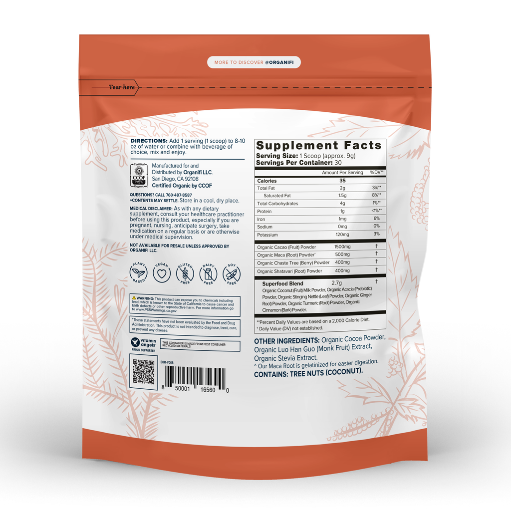 The rich and creamy chocolate taste is a result of the carefully crafted blend of cacao, and adaptogens - lightly sweetened with zero-sugar monk fruit. Most women prefer adding it to their morning or midday beverage for a holistic boost of energy and vibrance no matter the time of the month.