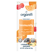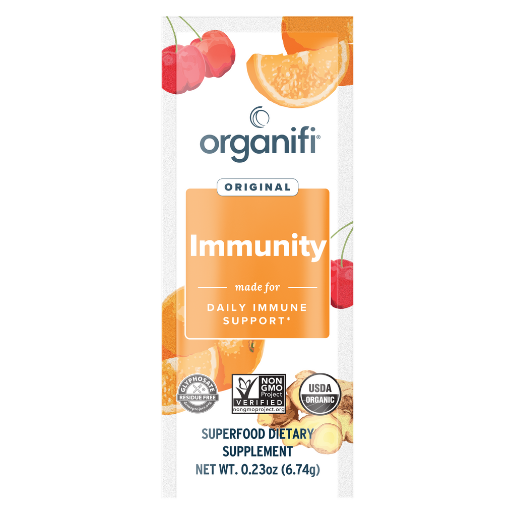 Enjoy a refreshing glass of citrus Immunity lightly sweetened with zero-sugar monk fruit and tastes of real orange, baobab fruit, ginger, and acerola cherry.