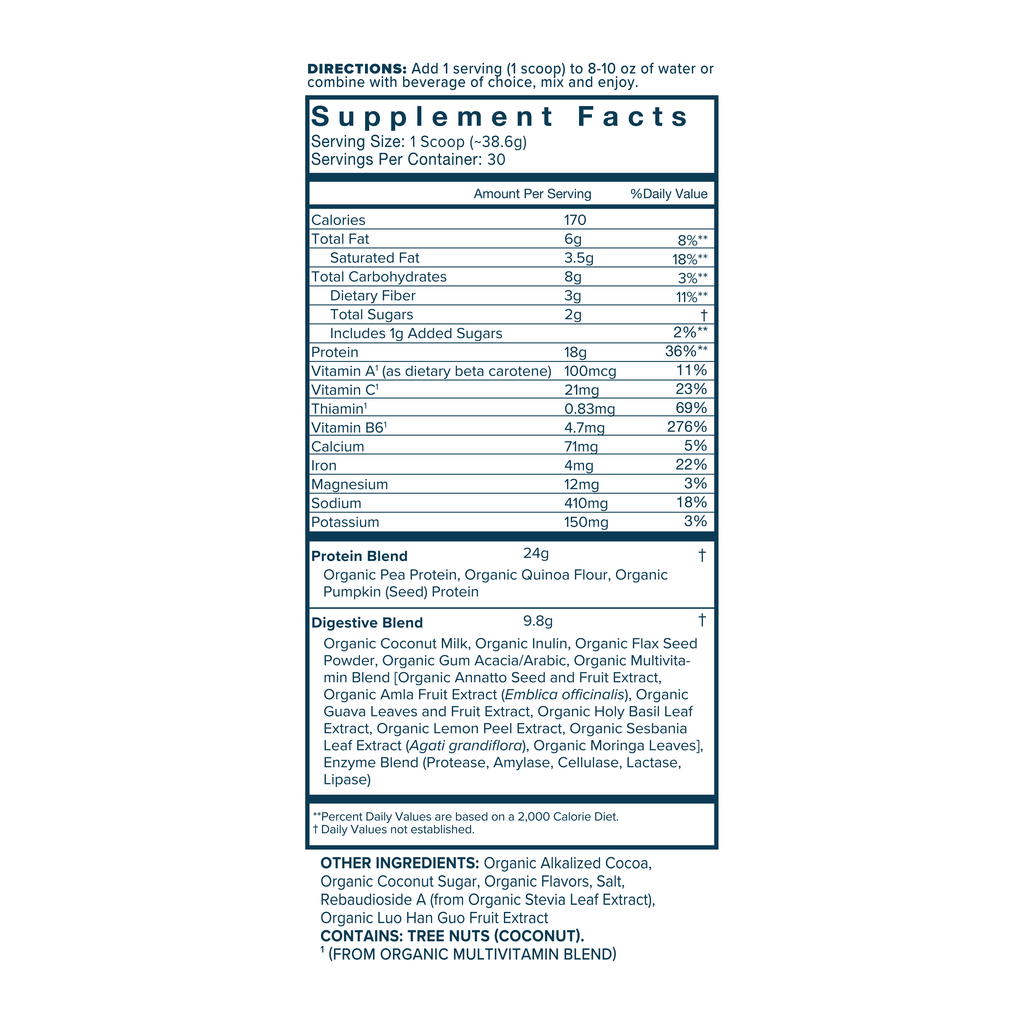 The taste of this rich shake is the result of a unique combination of three complex plant-based proteins and other organic whole foods containing vitamins and minerals for a daily protein shake made quick, easy, and enjoyable.